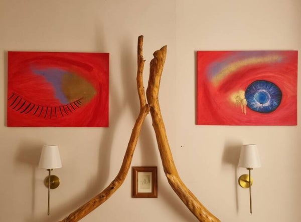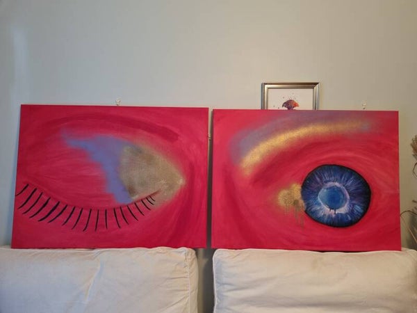 Painting as a diptych, with both eyes and paintings showing the process of emotions. This right eye is the emotional release of crying and the importance of it.