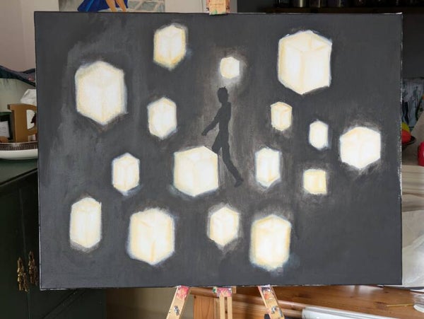 A figure walking through darkness surrounded by lanterns. Themes of loneliness, isolation but also hope on the light.